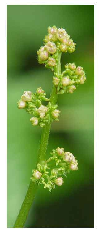 paniculately arranged cymes. Flowers are small, crowded, greenish,